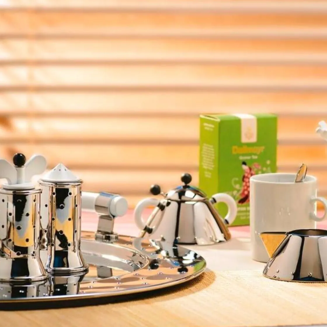 Der Salzstreuer, den Designer Michael Graves vor über 30 Jahren für die italienische Designschmiede entwarf, begeistert Designfans rund um den Globus. Geometrische Formen wie Kegel, Kugel und Zylinder ziehen sich durch die gesamte Kollektion. Sehen Sie sich die dazugehörige Pfeffermühle, die Zuckerdose, den Wasserkessel mit pfeifendem Vögelchen und das Rahmkännchen an. Jedes Stück für sich zieht alle Blicke auf sich. Denn Graves mixt Einflüsse aus Art-Déco, Pop-Art und Comic-Kunst in seinen Entwürfen, die heute echte Kultobjekte sind.