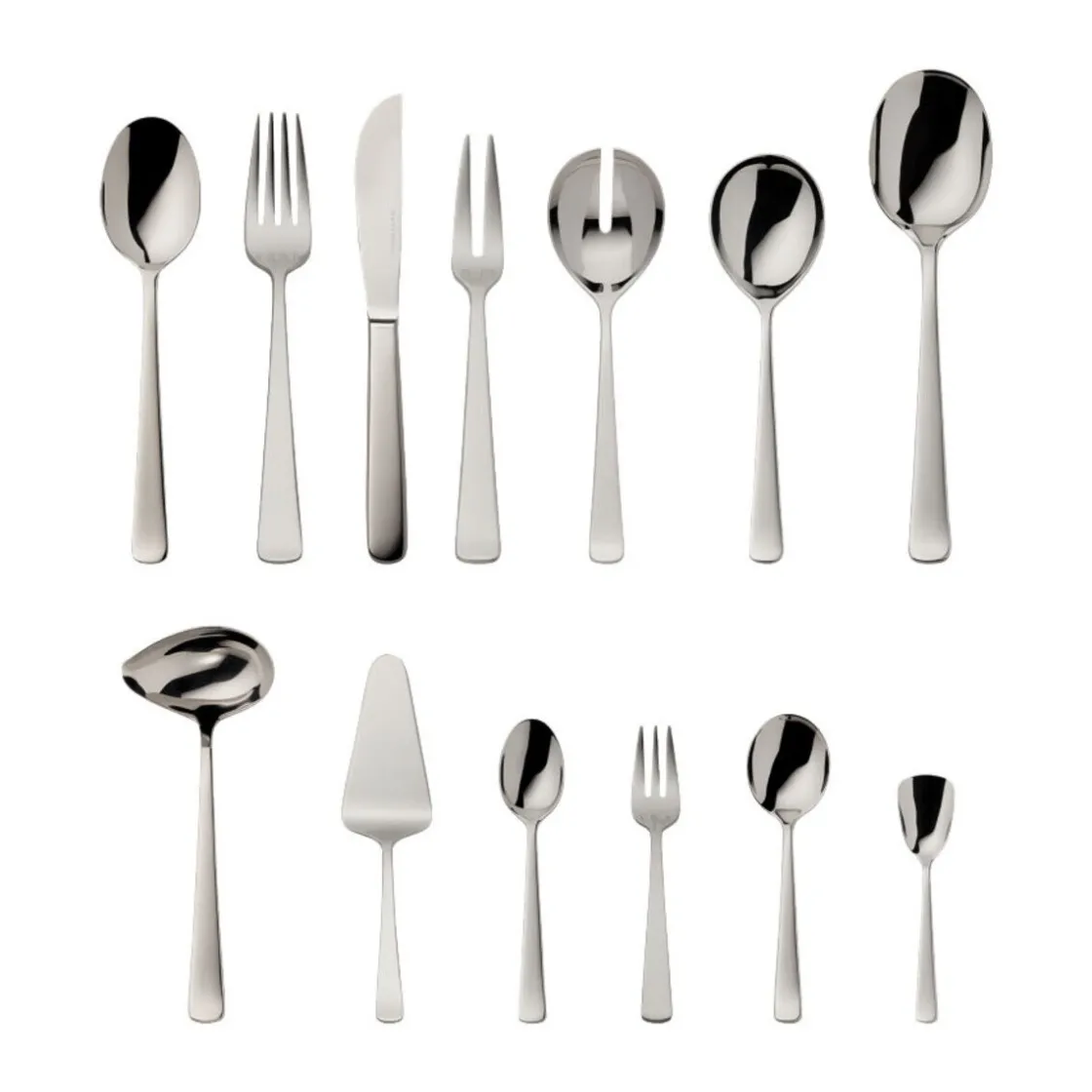 6 x Menülöffel, 6 x Menügabel, 6 x Menümesser, 6 x Kaffeelöffel, 6 x Kuchengabel, 2 x Fleischgabel groß, 2 x Servierlöffel, 1 x Sahnelöffel, 1 x Salatbesteck groß, 1 x Saucenlöffel, 1 x Tortenheber, 1 x Zuckerlöffel