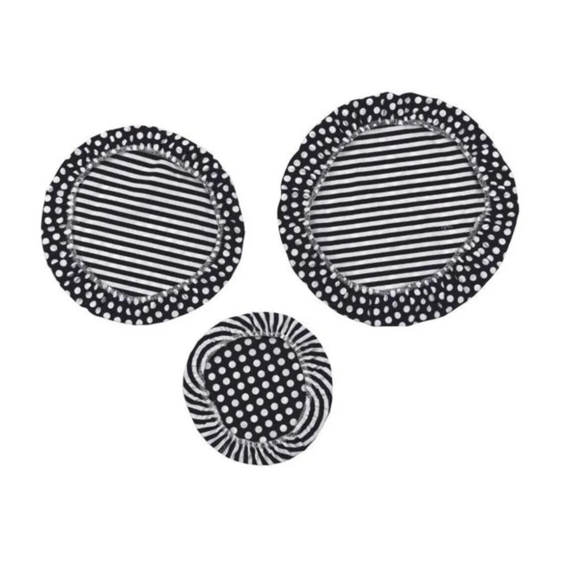In diesem Set sind 3 gemusterte, schwarz/weiße Bauwollabdeckungen in verschiedenen Größen enthalten.Die Abdeckungen sind ungewachst, waschbar, biologisch, 100% natürlich aus Baumwolle und plastikfrei.Sie kommen in den Durchmessern 20 cm, 25 cm und 30 cm und sind somit perfekt geeignet um Schüsseln mit Essen zu tranportieren oder vor Tieren zu schützen.