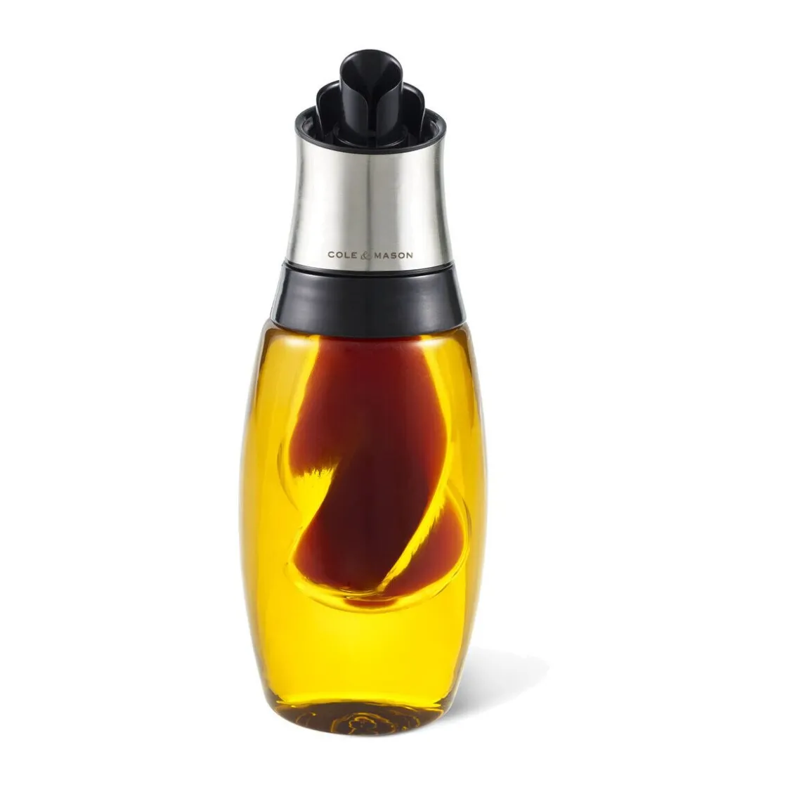 Mit dem formschönen Öl- und Essigspender Duo von servieren Sie aromaintensiven Balsamicoessig im geschwungenen Einsatz, während rundherum Olivenöl präsentiert wird. Selbst beim Ausgießen bleibt jede Flüssigkeit durch das clevere Rückflusssystem im richtigen Behälter.