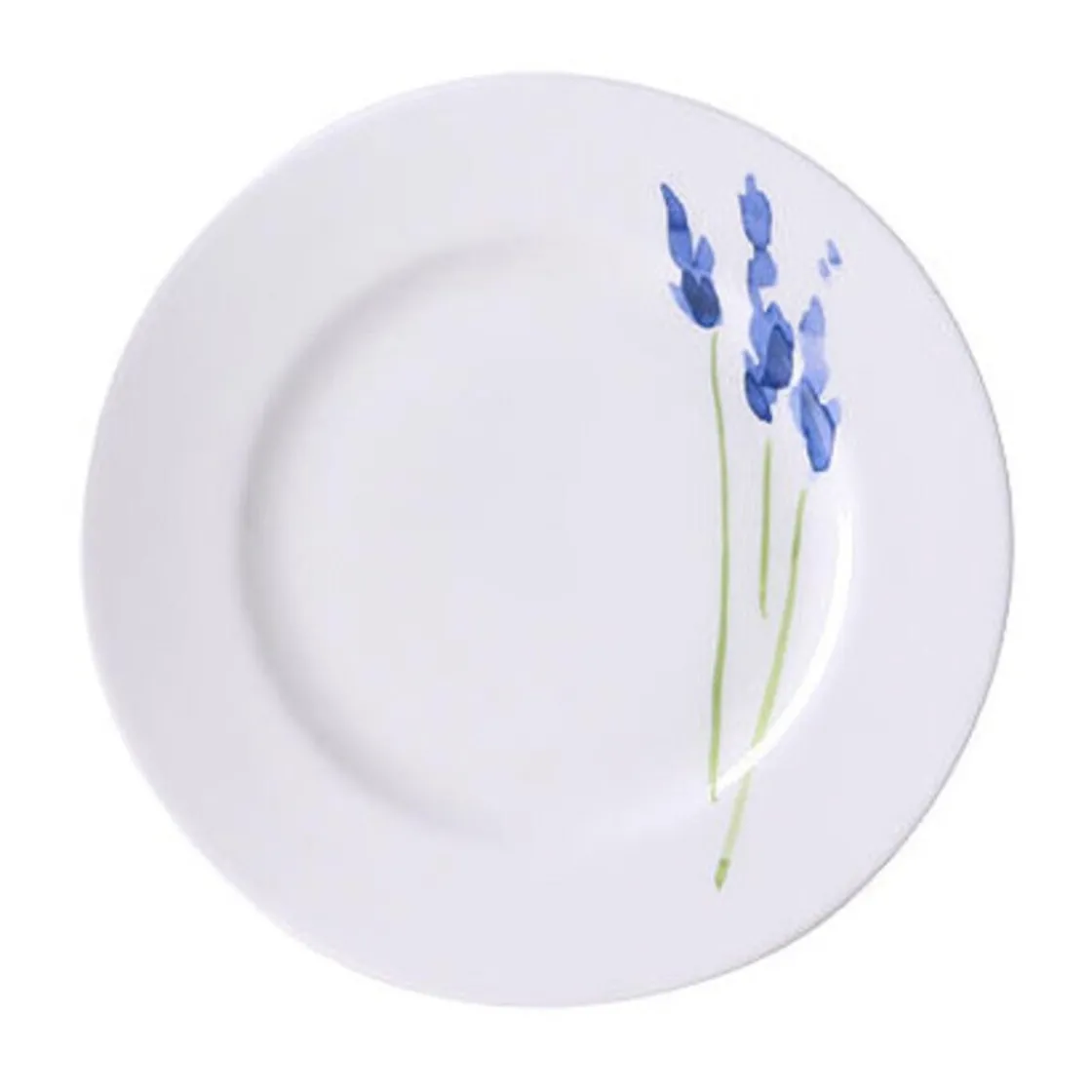 Der Dessertteller Impression Blau von begeistert durch sein dezentes Weiß, das von einer Aquarellblume geziert wird. Anmutig zieht sie sich über Fahne und Spiegel und verleiht der klar geführten Bauhausform einen Hauch von frühlingshaftem Leben.