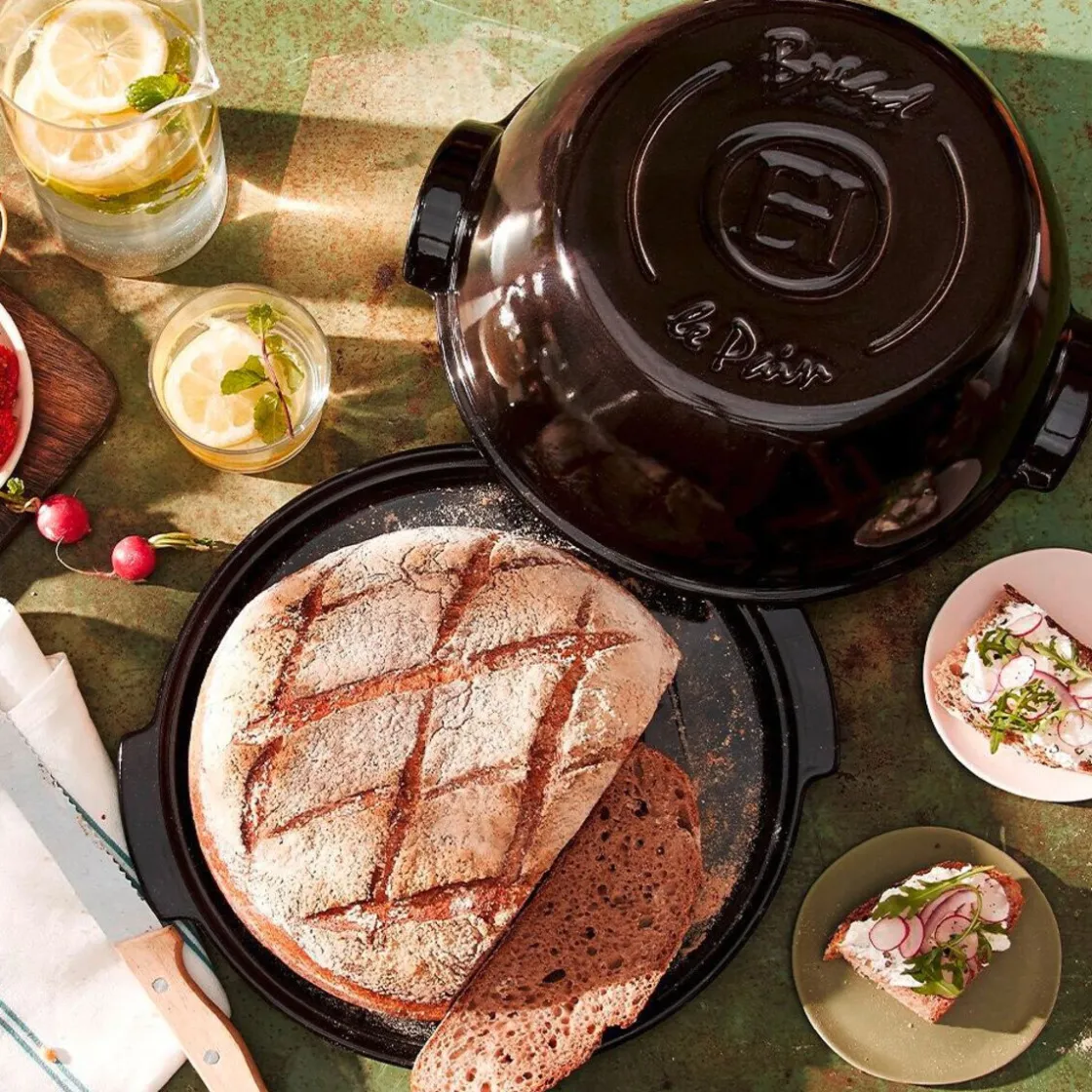 Mit dem Brot-Set Fusain von backen Sie duftendes Brot mit einem optimalen Feuchtigkeitsgrad. Die Haube fungiert wie die Wölbung herkömmlicher Brotbacköfen und lässt Dämpfe und Aromen unter sich zirkulieren.