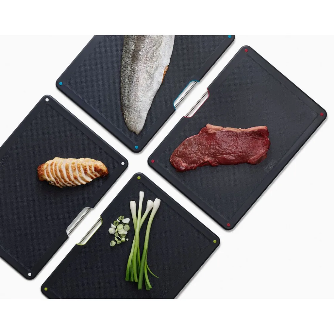 Das Schneidebrett-Set Folio von bringt Ordnung in das tägliche Schnippeln und Schneiden in der Küche. Sie erhalten vier Schneidebretter, die in einer Box aus Edelstahl platziert werden und dort zum Zugriff für Sie bereitstehen. Die schwarzen Bretter werden durch die verschiedenen Farben am Griff auseinandergehalten und können somit leicht für unterschiedliches Schnittgut verwendet werden.