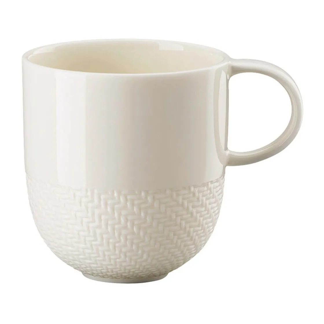 Mit dem Henkelbecher Kumi White tone von decken Sie Ihren Tisch mit dezenter Schönheit ein. Das sanfte Weiß mit seinem feinen Glanz und dem Flechtmuster im unteren Drittel des Bechers sorgt für beruhigende Harmonie auf dem Tisch und lässt sich nach Belieben in sanfte Arrangements integrieren.