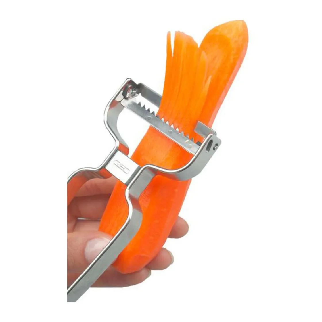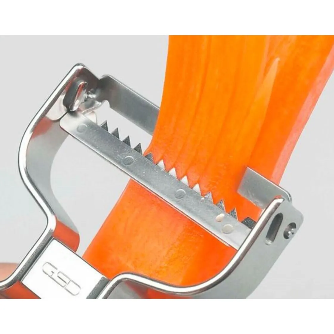 Der Julienneschäler von GSD besteht aus Edelstahl und entspricht in seiner Handhabung einem normalen Sparschäler. Durch die gezackte untere Klinge entstehen jedoch mit einem Schnitt mehrere hauchfeine Gemüsestreifen, die sich besonders gut für die asiatische Küche eignen.
