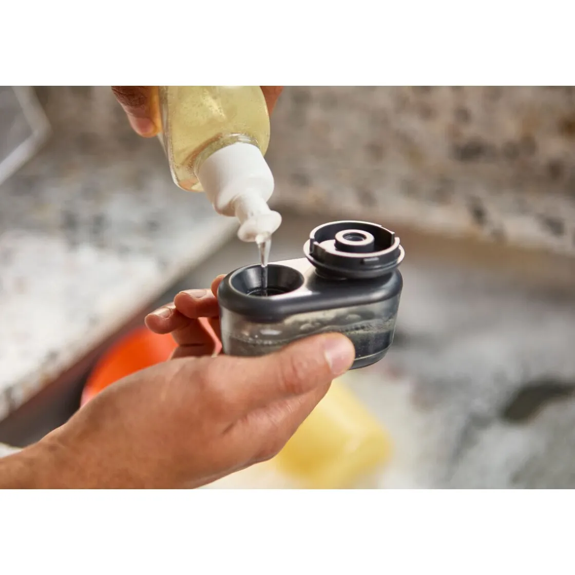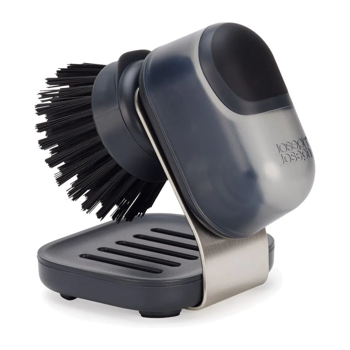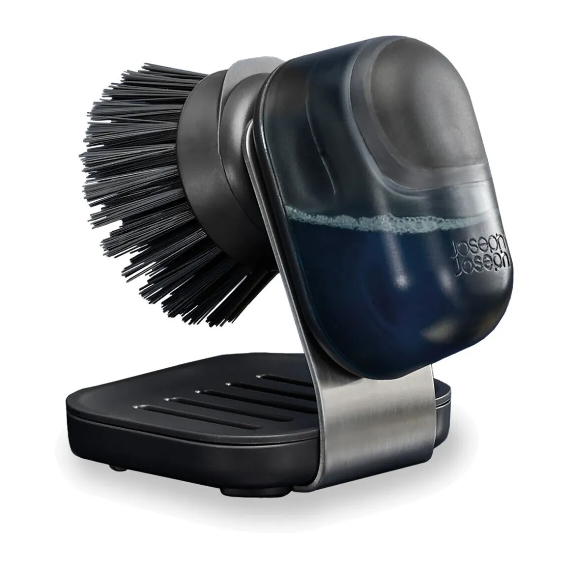 - der kompakte Griff lässt sich mit Spülmittel füllen, das er auf Knopfdruck abgibt