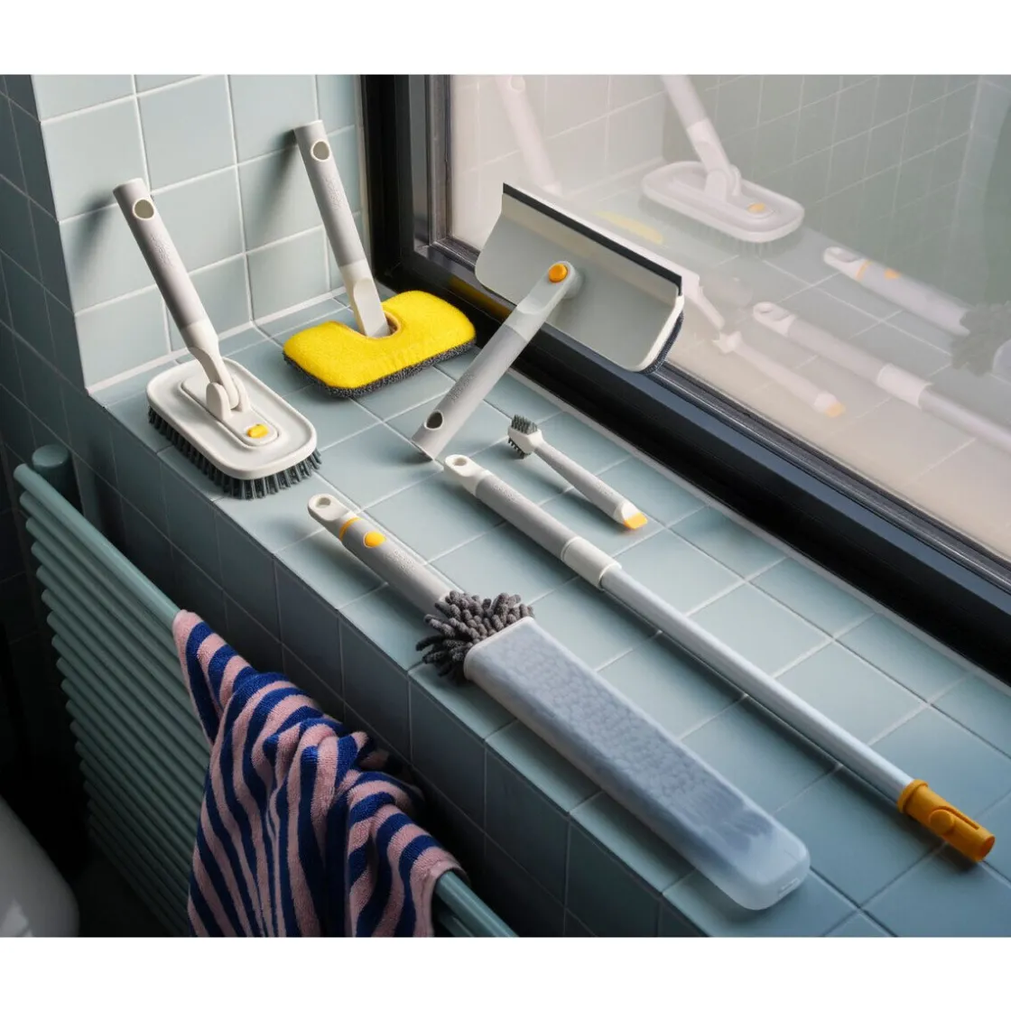 - besteht aus je 1x 2-in-1 Glasreiniger, 2-in-1 Fliesenreiniger, 3-in-1 Detailbürste, 2-in-1 Oberflächenreiniger, 3-in-1 Staubwedel mit Aufbewahrungshülle, Teleskopverlängerung
