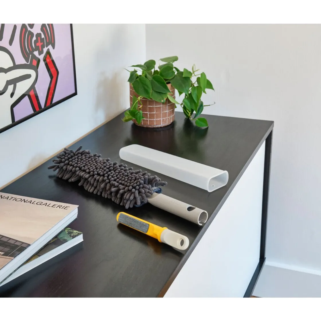 - die Stange, den Staubwedel und die Kunststoffteile mit einem feuchten Tuch von Hand reinigen