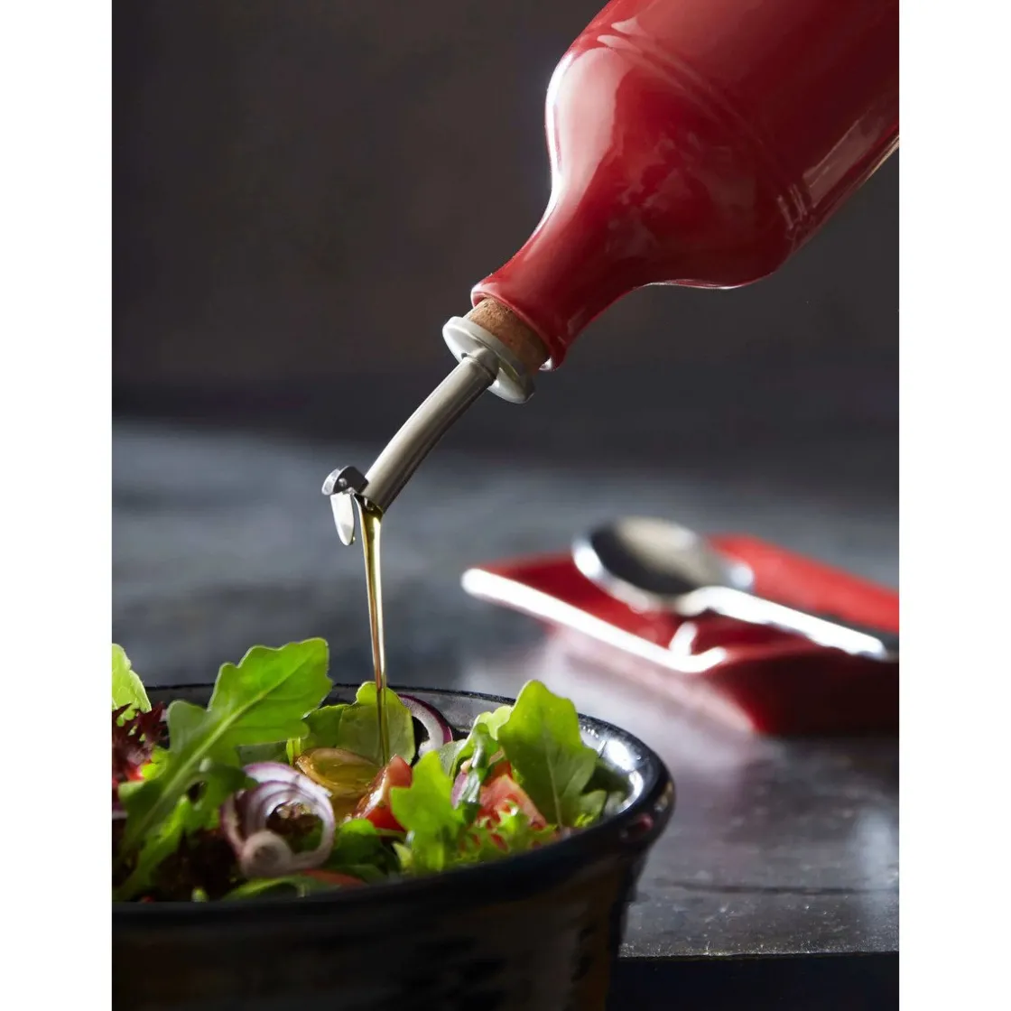 Mit dem Ölgießer Grand Cru von servieren Sie Olivenöl oder Leinöl auf stilsichere und aromaerhaltende Art. Die Keramik schützt das Öl vor Licht und zieht mit ihrem leuchtenden Rot die Blicke gekonnt auf sich.