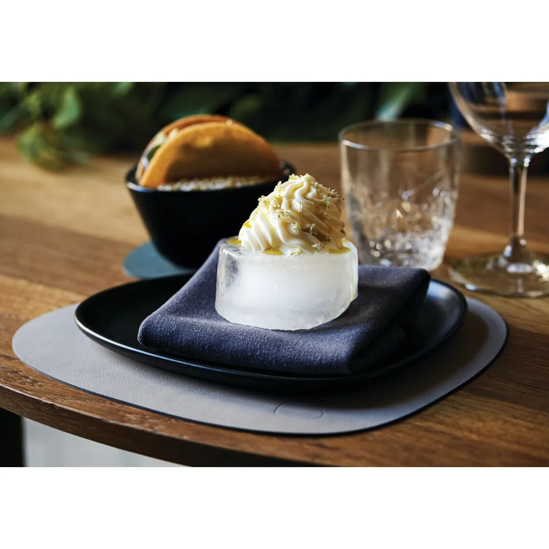 Bereits durch sein außergewöhnliches Design fällt das Tischset curve S mit einer Breite von 24 cm und einer Länge von 28 cm ins Auge. Seine einzigartige Form hebt sich von gängigen Konventionen ab und entwickelt sich zum echten Blickfang auf dem Küchentisch. Das spezielle recycelte Leder ist schmutz- und wasserabweisend. Bei der Farbgestaltung entschied sich der Hersteller für einen modernen hellgrauen Ton.