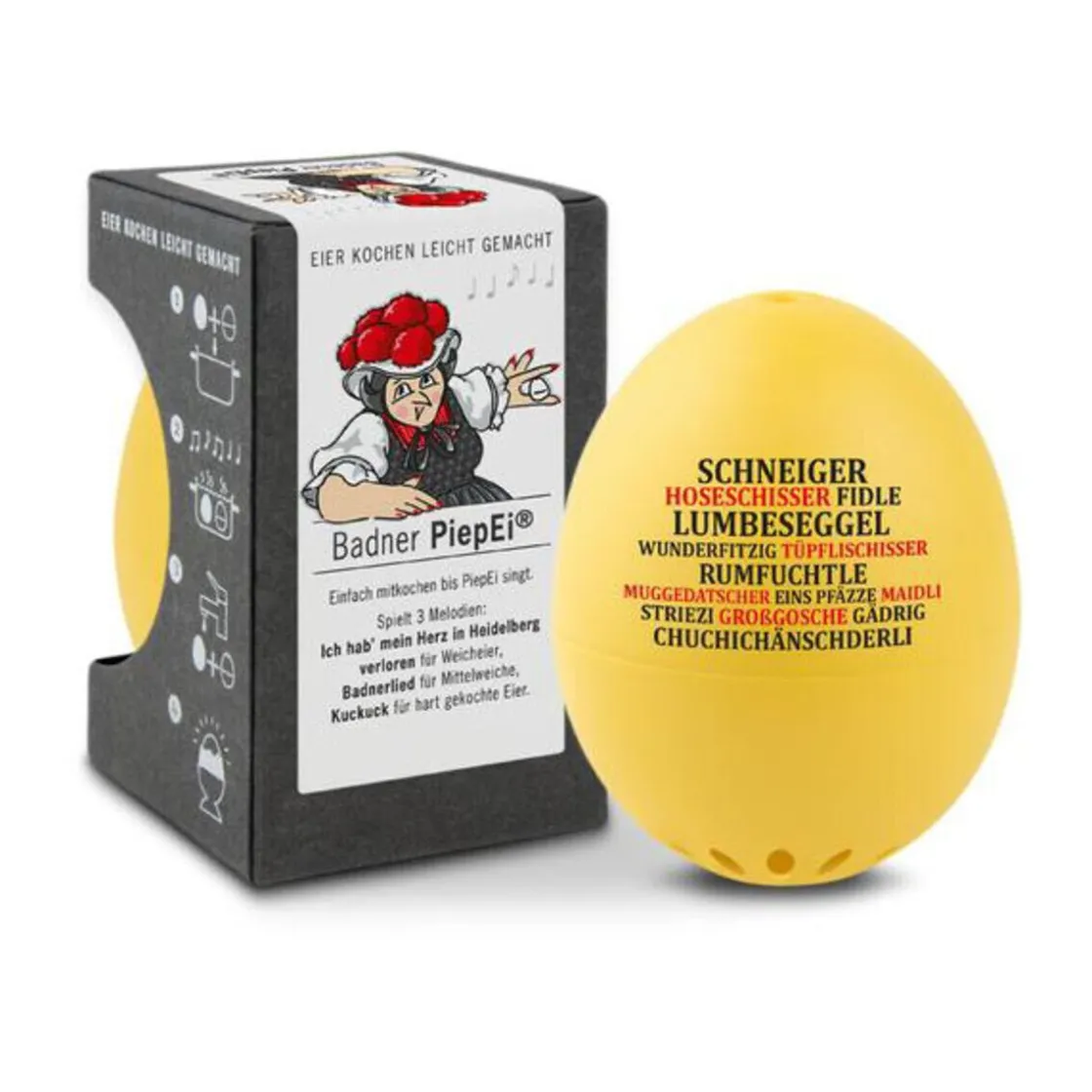 Das Badner PiepEi der PiepEi-Kollektion von löst das Dilemma zwischen „zu hart“ und „zu weich“ auf dem Weg zum perfekt gekochten Ei mit badischer Cleverness. Äußerst nutzerfreundlich lässt sich das PiepEi bedienen und sorgt für ein punktgenaues Kochen. Mit der Melodien-Technik, die für 3 unterschiedliche Härtegrade 3 verschiedene Melodien abspielt, wird selbst das Ei mit der härtesten Schale durch badischen Charme zu einem wachsweichen Softie.