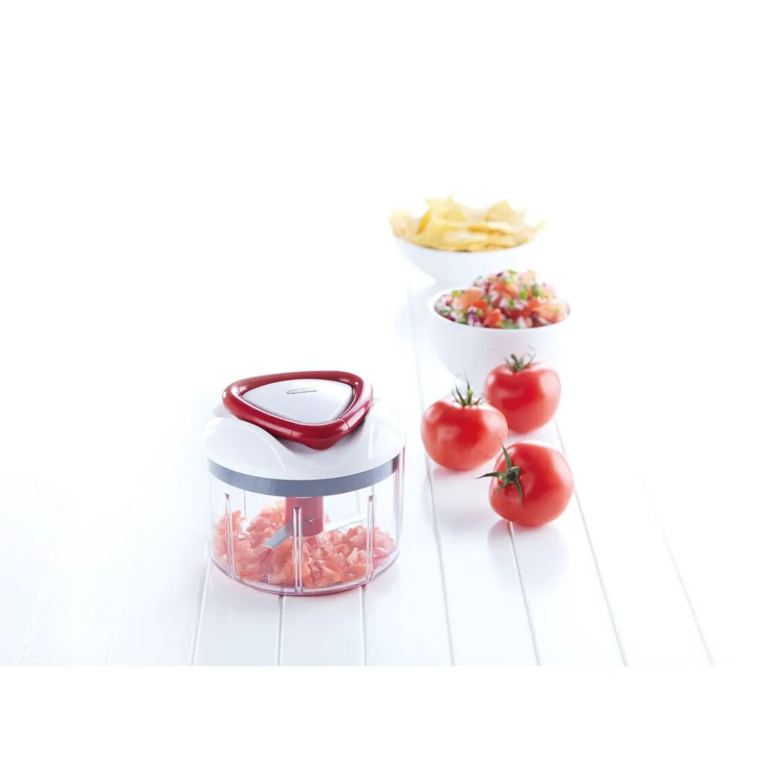 Mit dem manuell betriebenen Multischneider Easy Pull von wird grobes Hacken und feines Pürieren mit nur einem Gerät möglich. Egal, ob Sie Paniermehl, Marinaden oder Pesto herstellen wollen, wenn Sie oft genug am Seilgriff ziehen, bekommen Sie durch die rasiermesserscharfen Klingen alles klein.