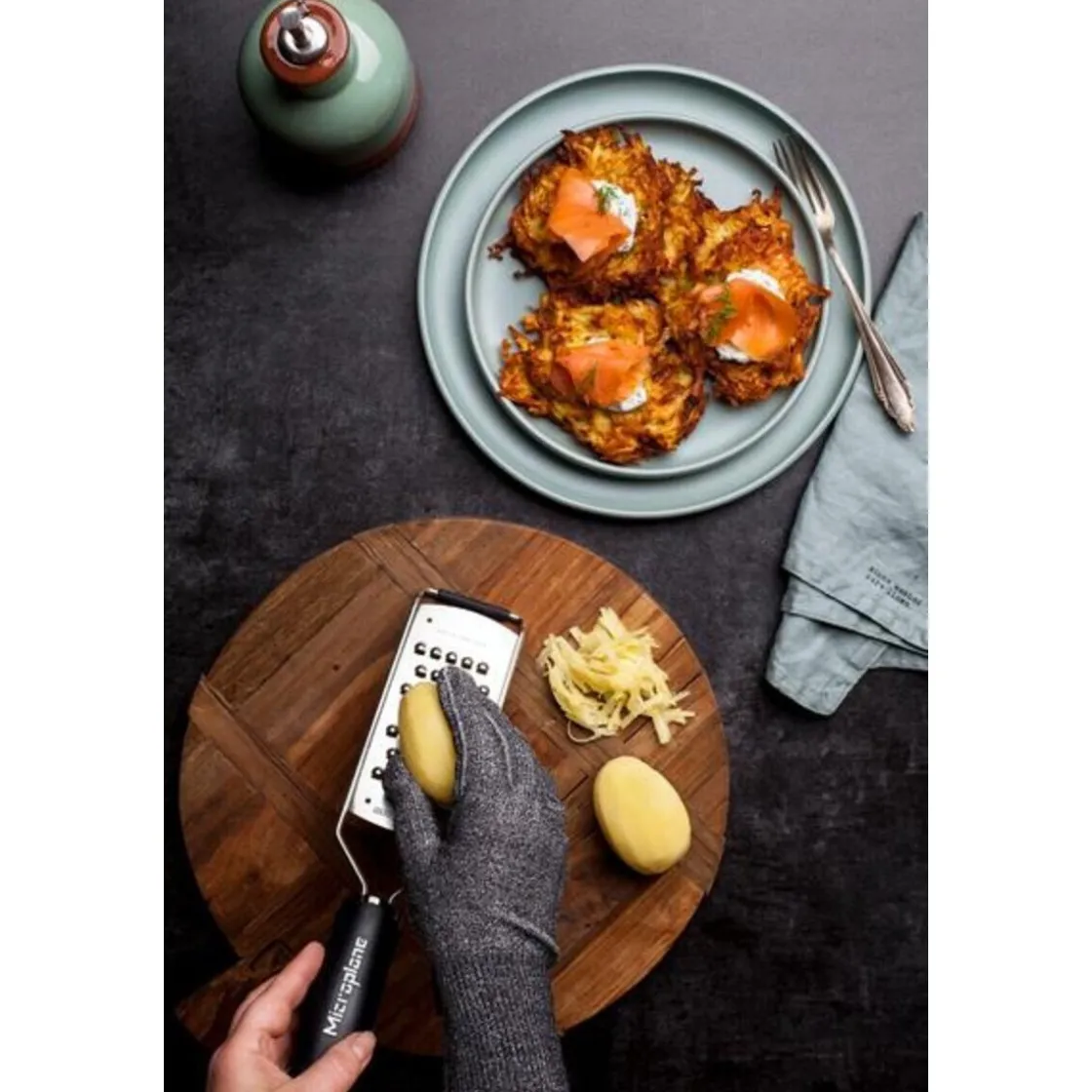 Um beim Reiben von Gemüse, Käse und Co. besonders vorsichtig zu sein, eignet sich der praktische Schutzhandschuh von . Für einen sicheren Umgang mit den rasiermesserscharfen Klingen der Reiben von Microplane.