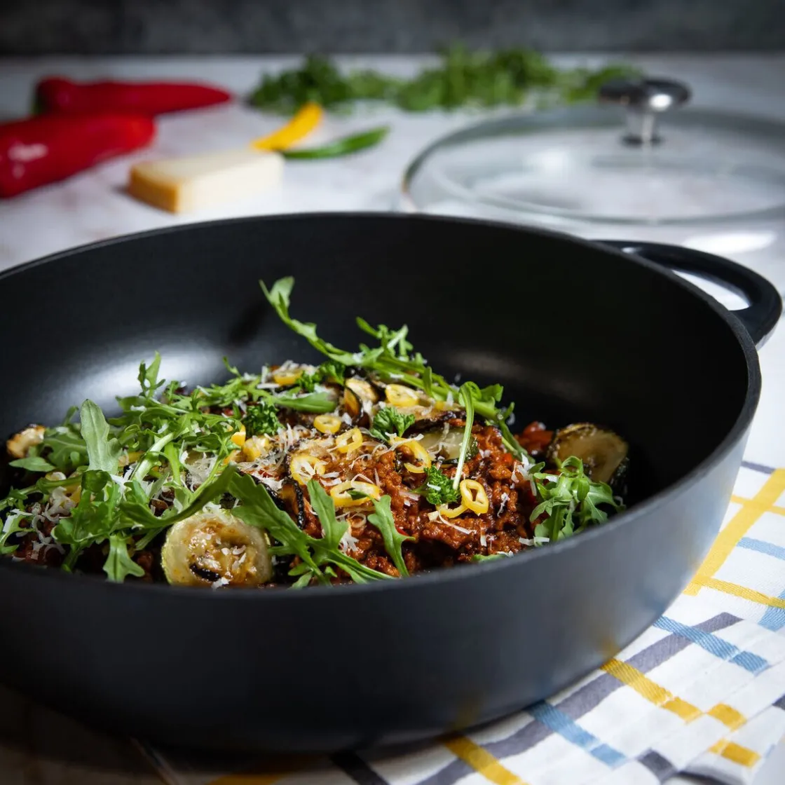 Die runde Bauernpfanne mit Glasdeckel Provence von gehört zu den wichtigsten Kochtöpfen in jedem Haushalt. Aufgrund der Ausführung in emailliertem Gusseisen ist sie äußerst energiesparend auf allen Herdarten, einschließlich Induktion. Sie zeigt sich außen in einem schlichten Schwarz, auf der Innenseite ist sie emailliert. Die Pfanne ist mit einem praktischen Glasdeckel kombiniert, wodurch Speisen lange warm bleiben. Aufgrund ihres Durchmessers von 28 cm hat sie ein Fassungsvermögen von 3,9 l und eignet sich ideal zum Schmoren und Braten – auch für größere Mengen.