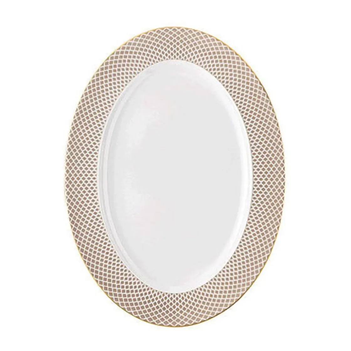 Die Platte der Geschirrkollektion Francis Carreau Beige von bietet genug Platz, um Speisen liebevoll und dekorativ zu platzieren. Der mit beigefarbenen Rauten verzierte Plattenrand setzt Ihre Häppchen behutsam in Szene. Das Dekor der Servierplatte wird raumgebend von weißen Freiflächen unterbrochen, die spielerisch über das Porzellan huschen. Die feine Goldkontur, die das Dekor abrundet, fließt wie ein schützendes Band über die Oberfläche.