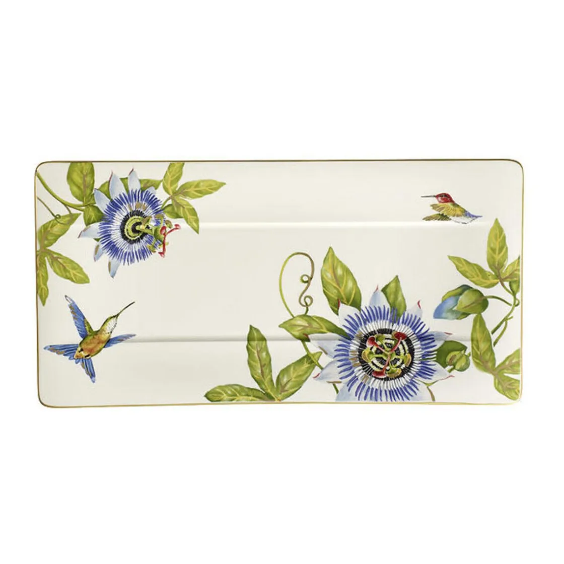 Auf dem Servierteller mit den Maßen 44×23 cm präsentieren Sie Häppchen, Fisch, Fleisch, Käse, Obst oder Gemüse. Die Herstellerfirma Villeroy & Boch hat dazu das Dekor bunt und detailreich ausgearbeitet. Kolibris, Maracujafalter, Orchideen und Passionsblumen erinnern an sommerliche Frische und Leichtigkeit. Der Servierteller gehört zur Kollektion Amazonia. Er besteht aus dem edelsten Porzellan der Welt: Premium Bone Porcelain. Der Teller kann zur Reinigung bedenkenlos in die Spülmaschine gegeben werden. Für die Verwendung in der Mikrowelle ist er jedoch nicht ausgelegt.