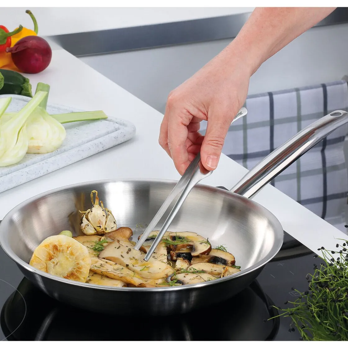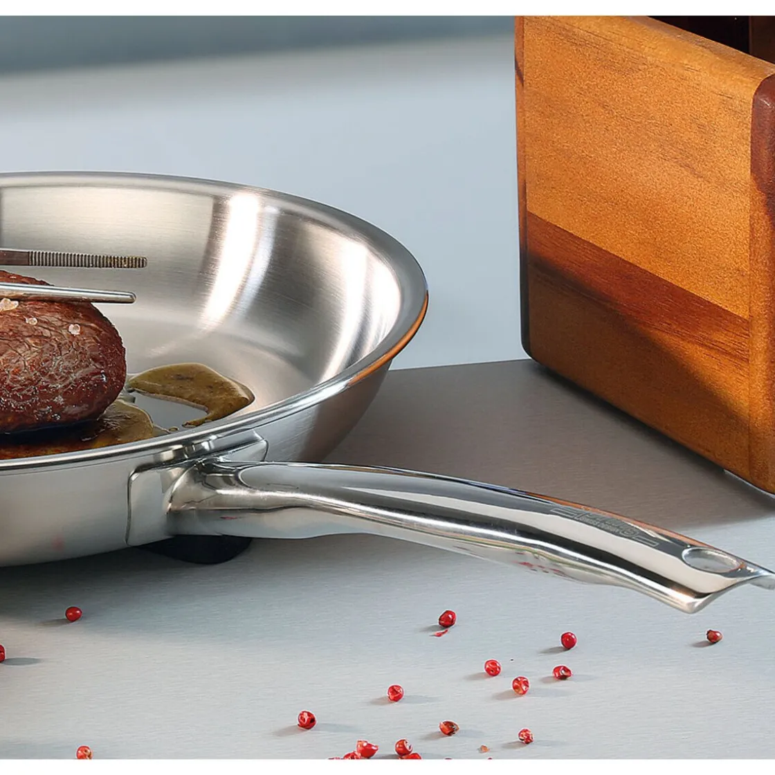 Hiermit gelingen alle Speisen, die scharf und kross angebraten werden sollen. Die doppelwandige Bratpfanne der Serie Brigade Premium von besteht aus einer massiven Edelstahlplatte mit integriertem Aluminiumkern. Somit kann Hitze lange gespeichert werden.