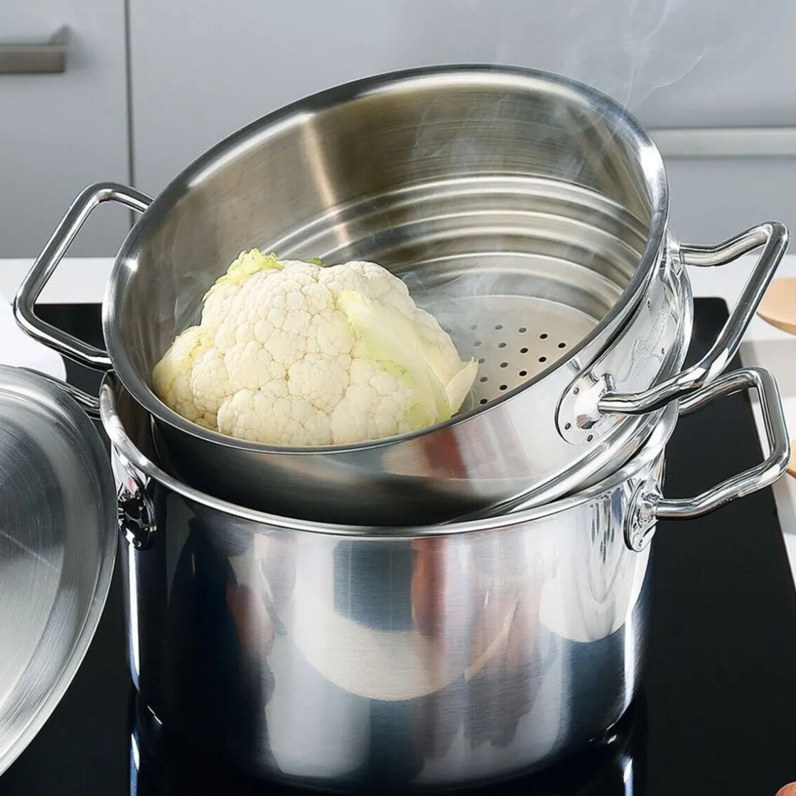 Der Dämpfaufsatz der Serie Brigade Premium von dient der schonenden Zubereitung von Gemüse. Beim Dämpfen bleibt das Gemüse knackig und die Vitamine verkochen nicht.