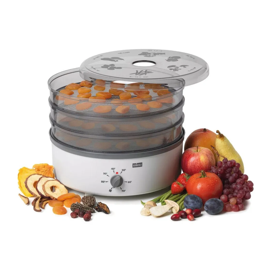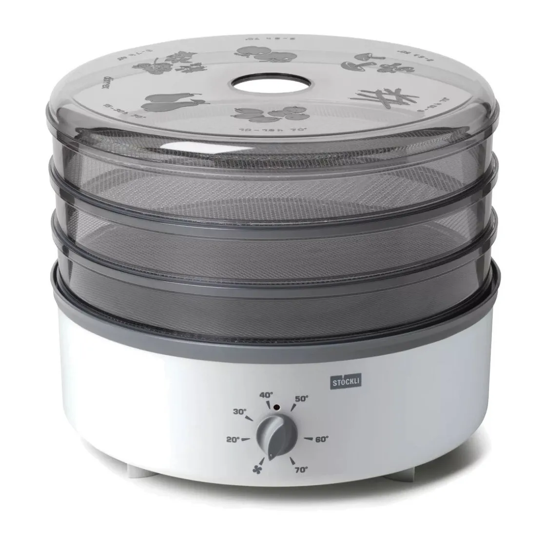 - Deckel zeigt Dörrzeiten für unterschiedliches Dörrgut an