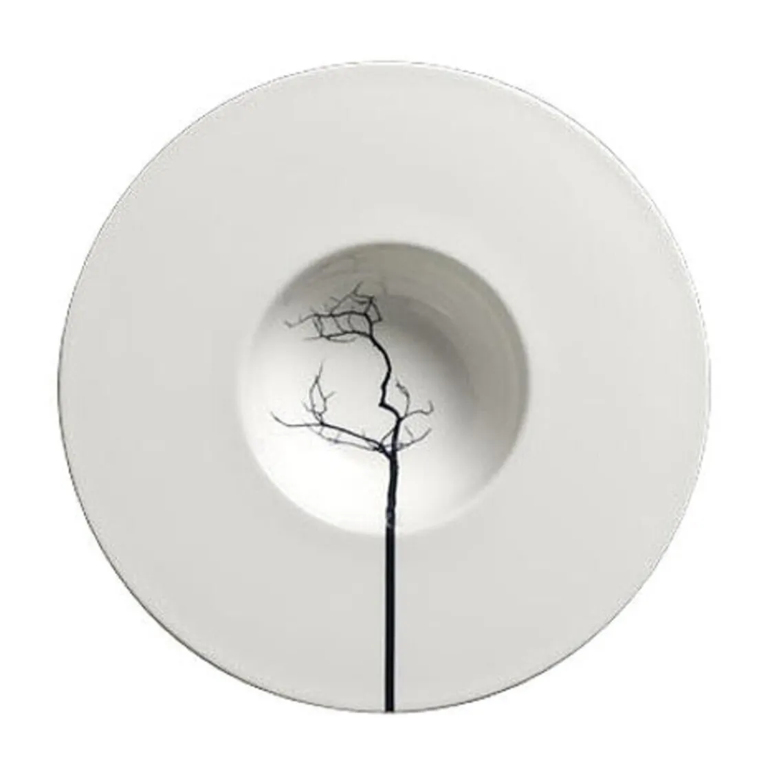 Der Suppenteller Black Forest von Dibbern ist ein wahres Kunstwerk an Funktionalität und Optik. Der tiefe Teller mit breitem Rand hat einen Durchmesser von 26 cm und fasst 0,25 l. Er ist aus hochwertigem Knochenporzellan gefertigt und spülmaschinenfest. Das Besondere an diesem Modell ist neben dem breiten Rand das schwarze Dekor auf weißem Hintergrund. Hierbei handelt es sich um einen schlanken Baum mit Astwerk, der von einem Rand des Tellers bis in die Vertiefung verläuft – edel und stilvoll.