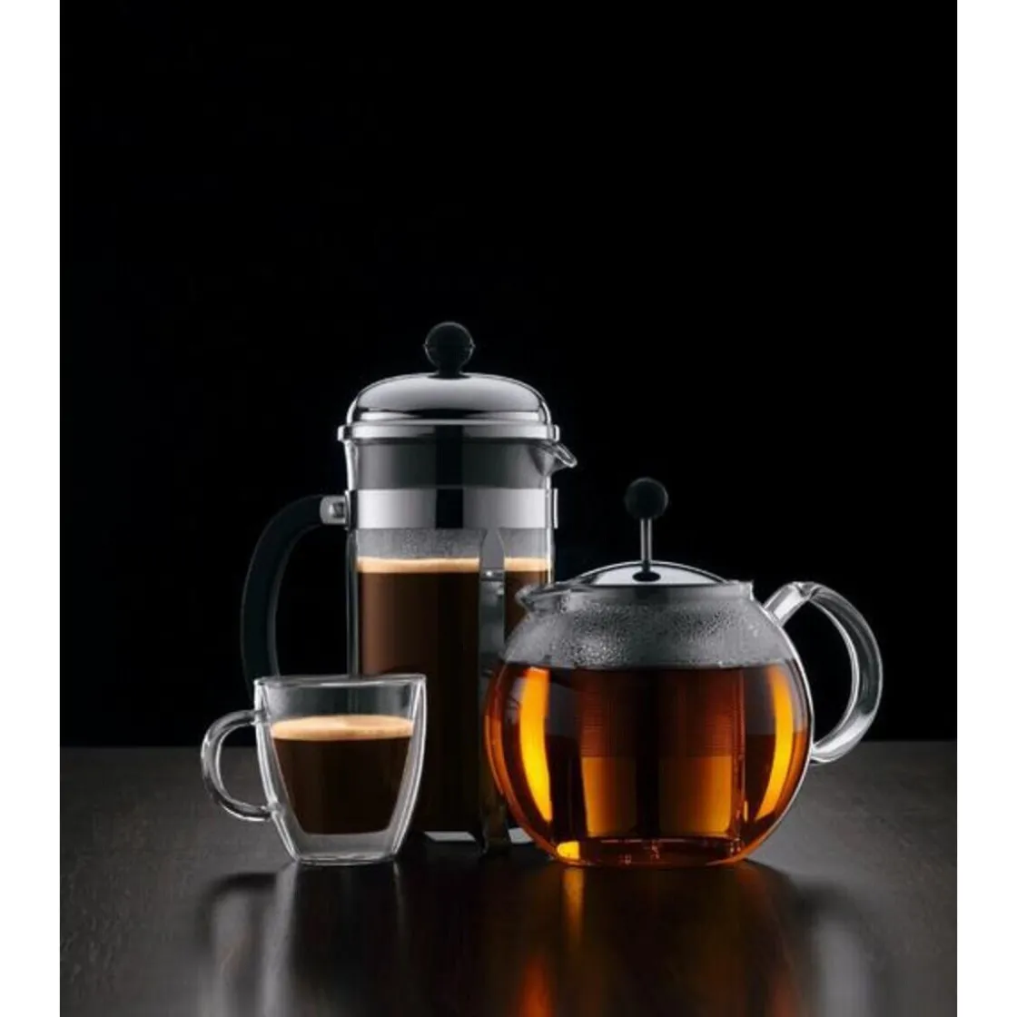 Der optisch ansprechende Teebereiter Assam mit einem Fassungsvermögen von 1,5 l aus dem Hause Bodum ist aus bruchsicherem Glas gefertigt, das in der Spülmaschine gereinigt werden kann. Der schöne Edelstahlfilter, der im Inneren der gefüllten Kanne schimmert, ist chromfarben gestaltet. Mit einem Volumen von 1,5 Litern ist dieser Teebereiter sowohl für heißen Tee an kalten Tagen als auch für Eistee im Hochsommer geeignet. Tee gelingt mit dieser Kombination aus Kanne und Filter sowohl mit Teebeuteln als auch mit losem Tee.