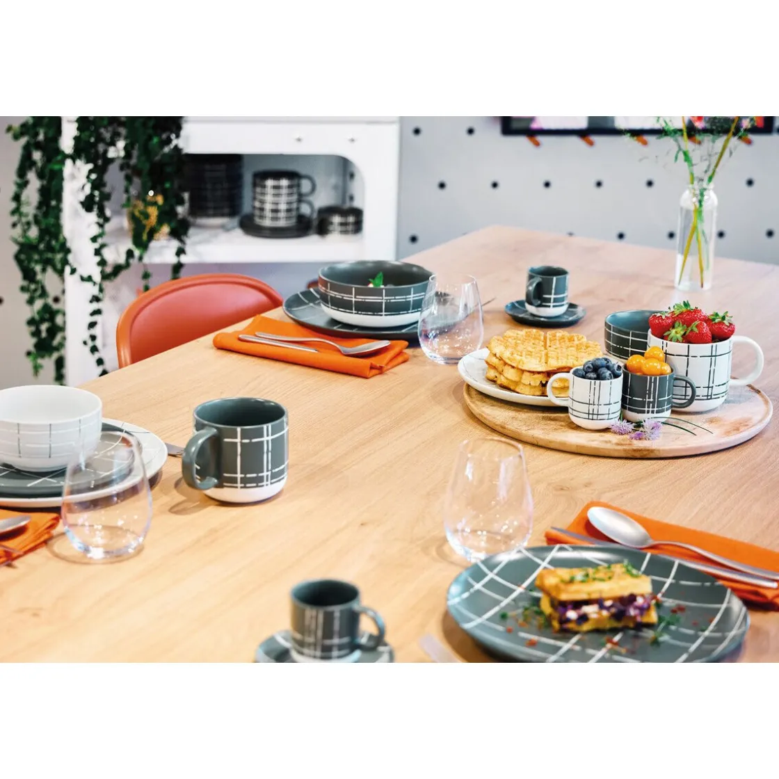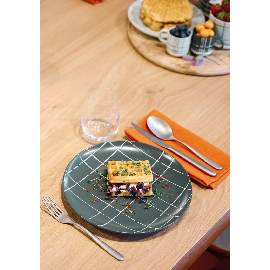 Mit dem Teller tief Fun Karo dark von sorgen Sie für moderne Individualität auf der Tafel. Die Innenseite ist mit lebhaften Linien verziert, die reliefartig aufgetragen sind und an Pinselstriche mit unterschiedlich starken Nuancen erinnern. So entsteht eine Karo-Musterung, die sich auf dem verführerischen Grün ausgezeichnet macht und Ihre Gäste zum Genießen einlädt.