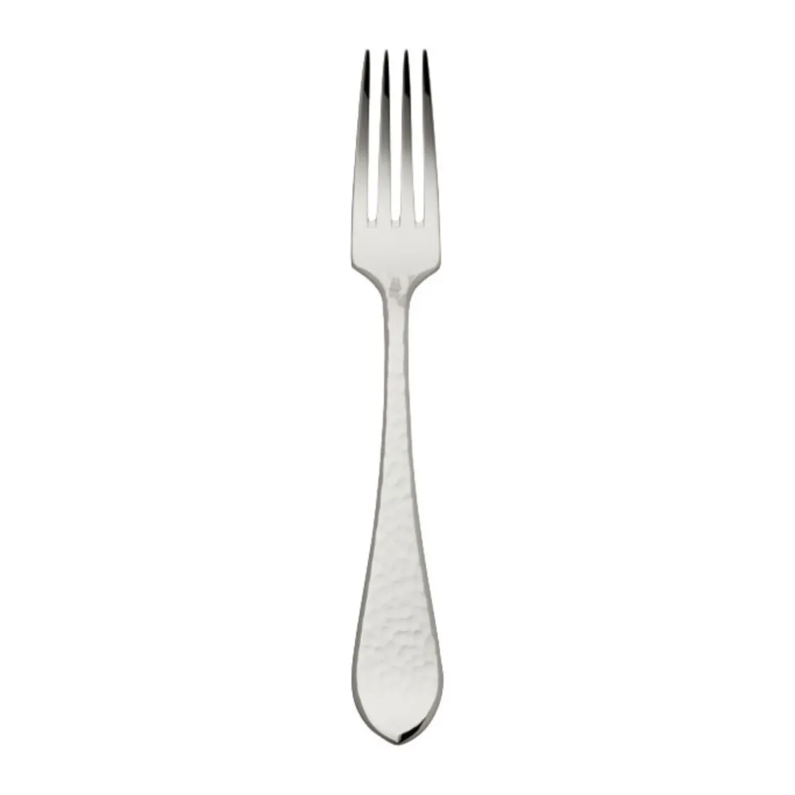 Die Menügabel Martelé von kommt mit einer gespannten Silhouette und klaren Linien daher. Der spitz zulaufende Stiel weist eine facettenreiche Optik auf, die durch Hammerschläge entsteht und zwischen den Fingern spürbar ist. Kredenzen Sie Ihr Menü durch diese Gabel mit einem faszinierenden Lichtspiel.