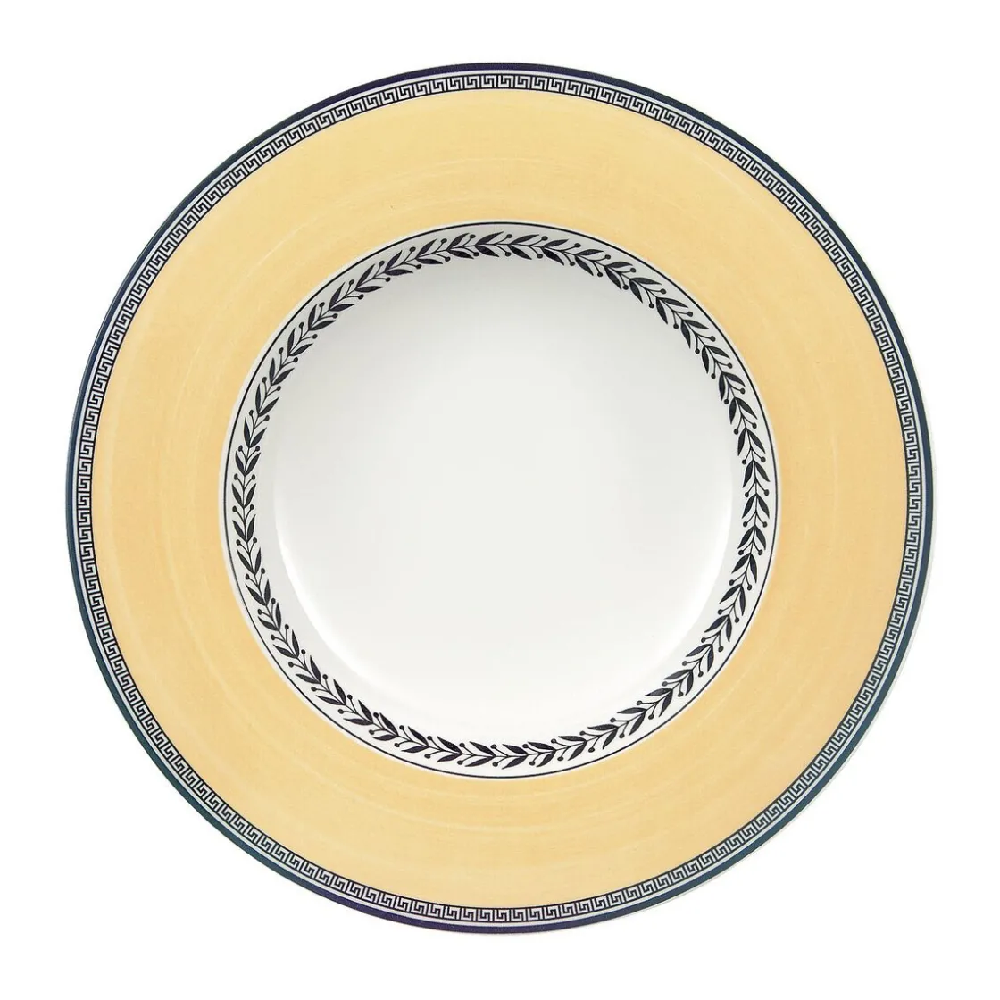 Mit dem Suppenteller Audun Fleur von kommt ein warmes Leuchten auf den Tisch. Die gelbe Färbung der Fahne ist von einem feinen Wascheffekt geprägt, der von einem filigran gestalteten Lorbeerkranz abgeschlossen wird und hierdurch einen dekorativen Charme erhält. Kredenzen Sie Ihre Suppen durch diesen Teller mit einem hohen Gemütlichkeitsfaktor.