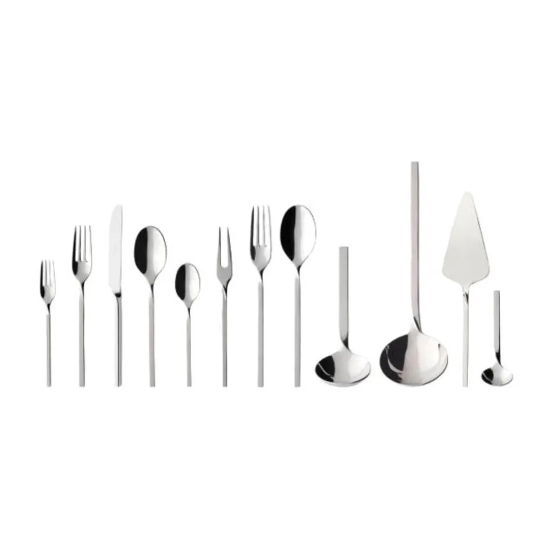 - Set enthält 12 Tafellöffel, 12 Tafelgabeln, 12 Tafelmesser, 12 Kaffeelöffel, 12 Kuchengabeln, 1 Fleischgabel, 2 Serviergabeln, 3 Servierlöffel, 1 Saucenlöffel, 1 Suppenschöpfer, 1 Tortenheber, 1 Zuckerlöffel und eine Besteckkassette