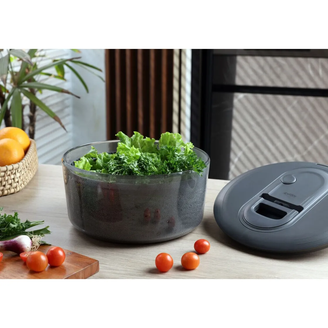 Durch die praktische Salatschleuder EasySpin von lässt sich Ihr Salat in Nullkommanichts waschen, schleudern, kredenzen und aufbewahren. Einfach den Seilzug betätigen und die Schleuder zum Rotieren bringen – schon wird überschüssiges Wasser nach außen gedrängt. Sorgen Sie mit dieser Schleuder für knackfrischen Salat auf dem Tisch.
