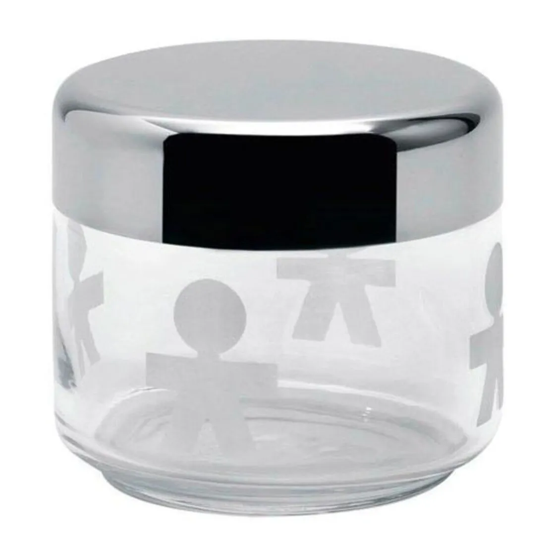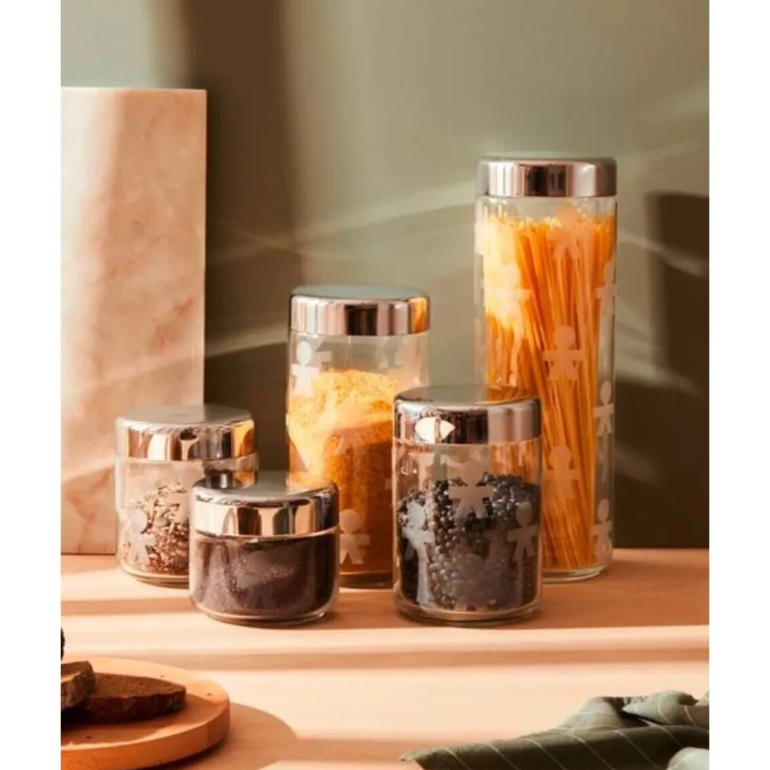 In den Küchendosen Girotondo von passen allerlei Lebensmittelvorräte hinein. Die schlicht geformten Glasdosen in verschiedenen Größen sind mit weißen Strichmännchen verziert, die diese Kollektion so besonders machen. Mehrere dieser transparenten Boxen im offenen Küchenregal bieten jederzeit Einblick und sind auch optisch ein Blickfang. Glanzvolles Highlight sind die Deckel aus poliertem Edelstahl.