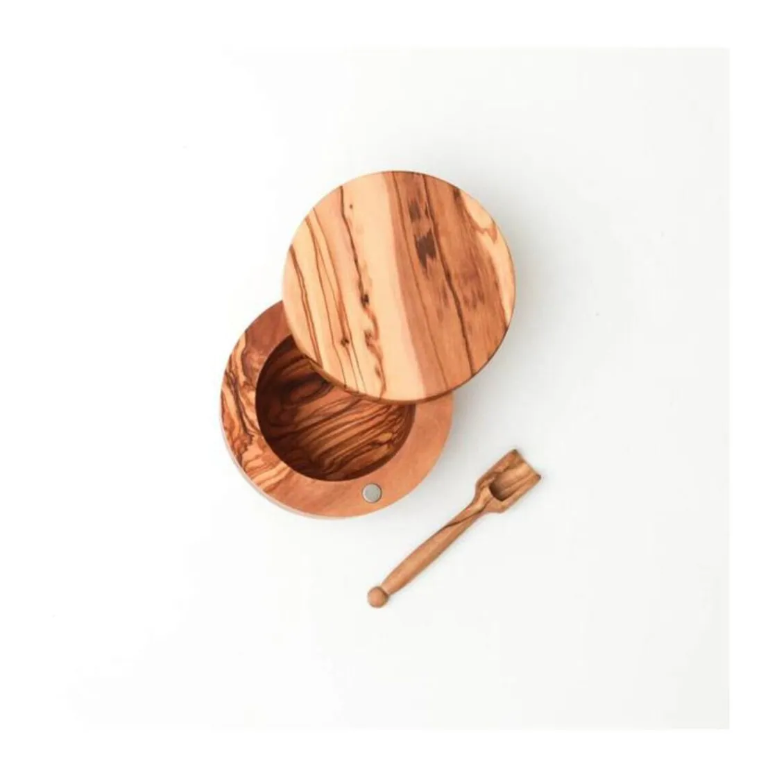 - Salzbehälter mit Deckel und Löffel aus massivem Olivenholz gefertigt
