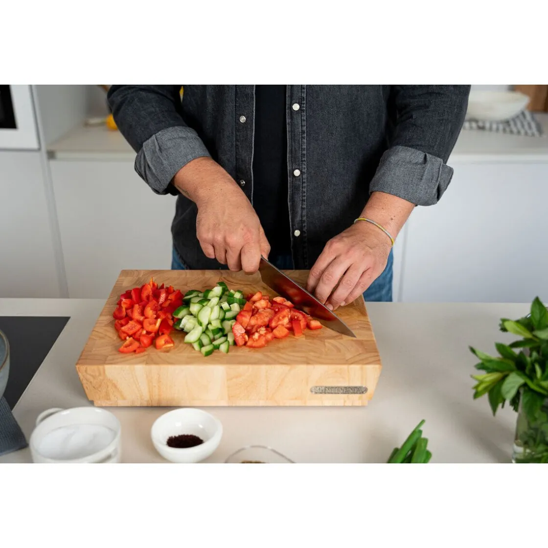 Auf dem hochwertigen Hackblock von zeichnet sich ein stimmungsvolles Mosaik aus edlen Holzwürfeln ab.