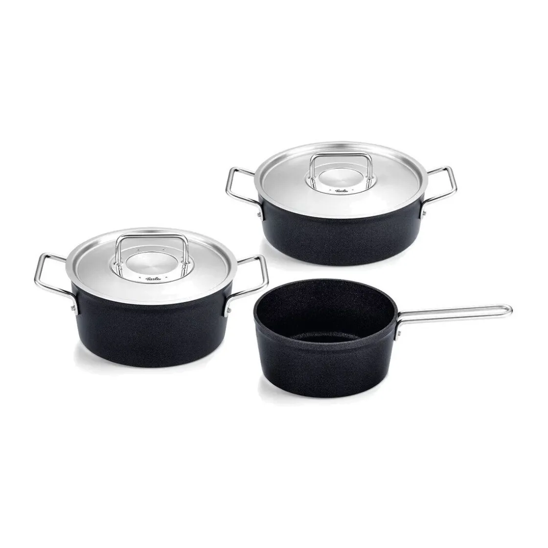 - besteht aus einem Kochtopf (20 cm), einem Bratentopf (24 cm) und einer Stielkasserolle (18 cm)