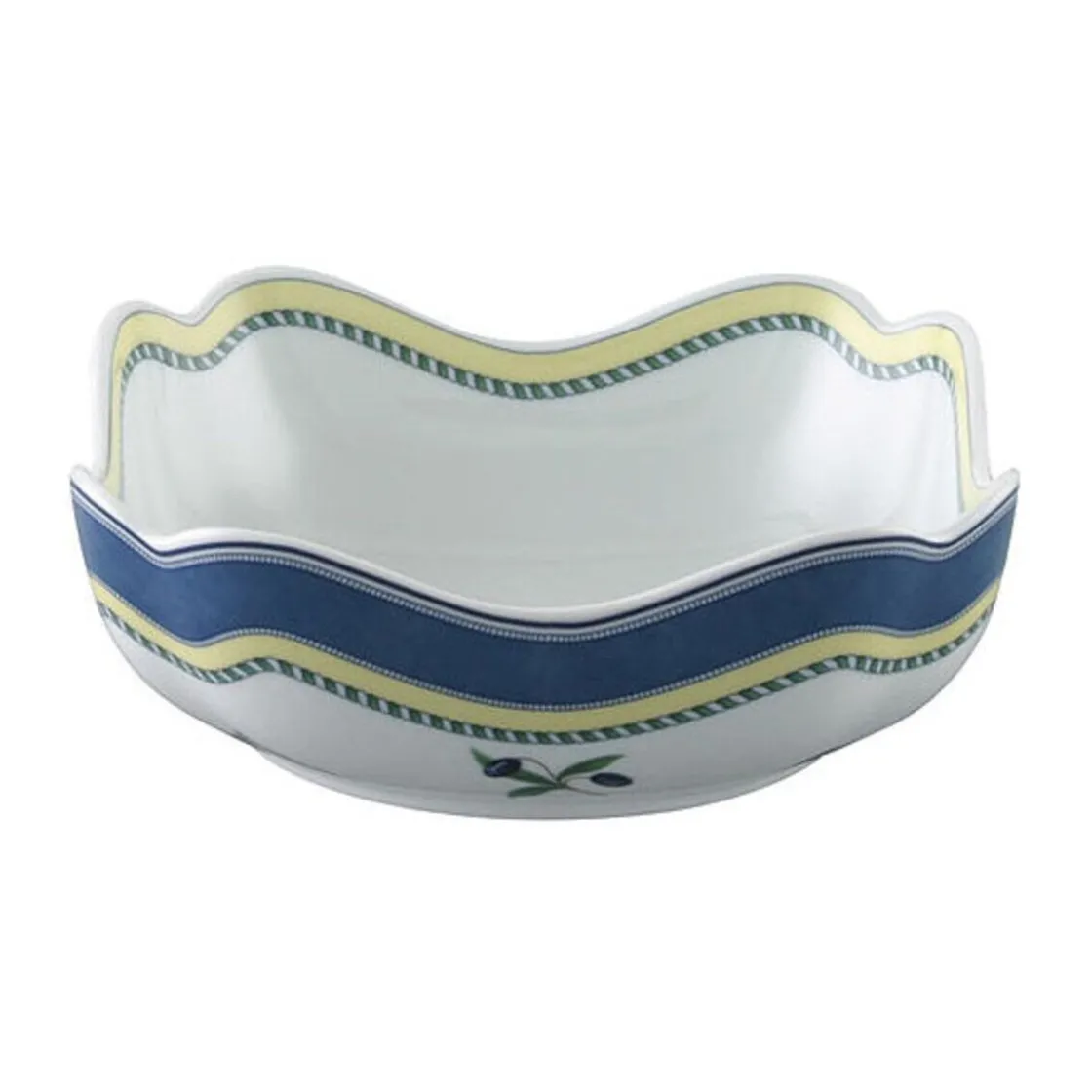 In der Schüssel Maria Theresia Medley der Marke lassen sich Salate und Beilagen auf verspielte und zugleich klassische Art servieren. Der gewellte Rand und die farbigen Bänder machen das ruhige Porzellan lebendig und ausdrucksstark.