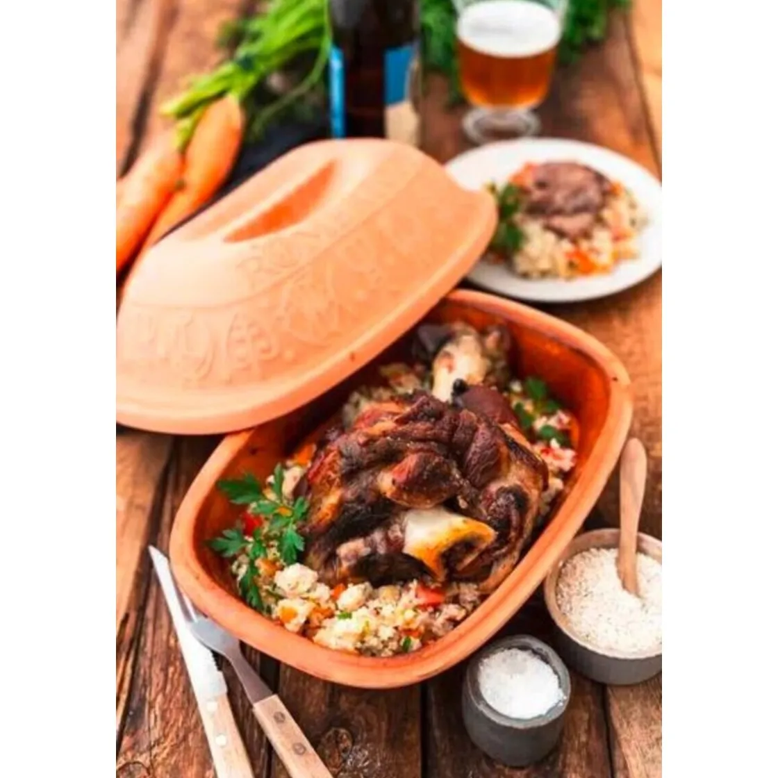 Im Römertopf Thermo Klassiker von Römertopf werden alle Speisen sanft und schonend gegart. Wertvoller Gemüsesud und Bratensaft bleiben erhalten. Aufgrund seiner Größe von 39x27x19,5 cm ist er auch für größere Braten, Gans oder Pute bestens geeignet. Der formschöne, innen glasierte und spülmaschinengeeignete Keramikbräter mit 5 kg Fassungsvermögen hat zwei integrierte Griffe. Dank seines dekorativen Keramikmusters können die darin zubereiteten Speisen direkt am Tisch serviert werden.