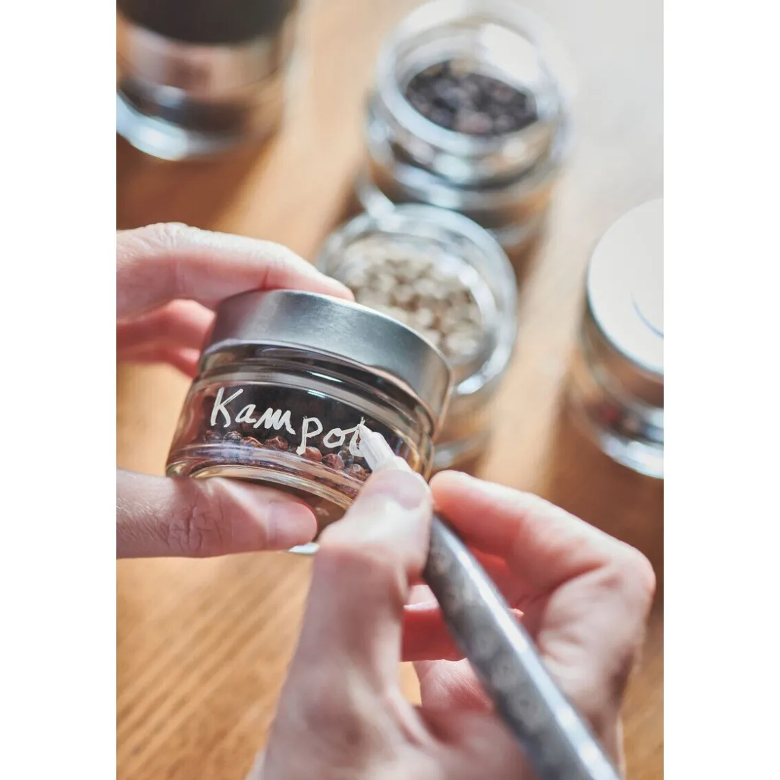 Die Vorratsgläser Maestro von sind kompatibel zur Pfeffermühle Maestro und lassen sich mit Ihren bevorzugten Pfeffersorten befüllen. Mit dem beiliegenden Filzstift lassen sich die Gläser immer neu beschriften und für verschiedene Sorten verwenden.