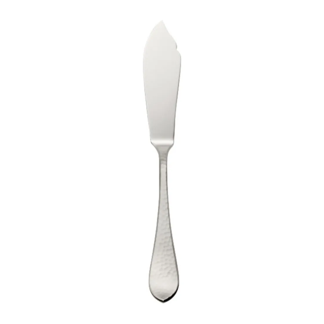 Das Fischmesser Martelé von ist durch eine speziell geformte, stumpfe Klinge gekennzeichnet, die sich gekonnt zwischen die Fischhaut und das Fleisch schieben lässt. Das Fleisch wird dabei nicht beschädigt. Nutzen Sie dieses Messer zum Teilen des Fisches in mundgerechte Portionen.