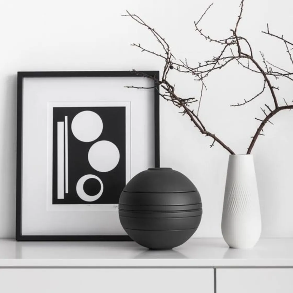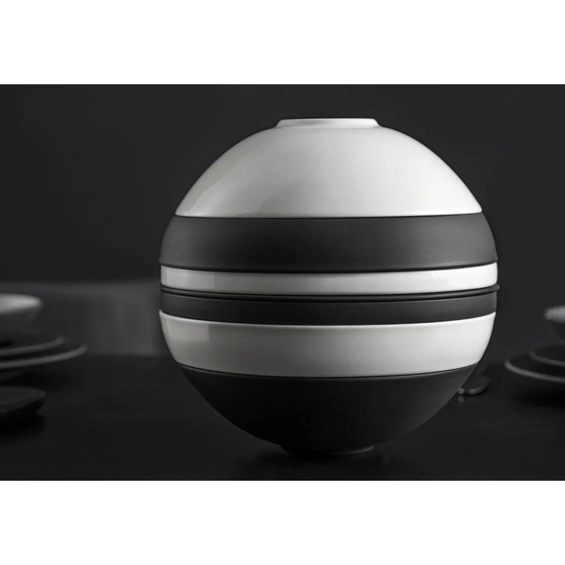 Das Geschirr-Set La Boule Iconic Black von ist wie ein Überraschungspaket: Erst einmal ausgepackt, kommt noch mehr Freude auf. Die zu einer Kugel gestapelten sieben Geschirr-Teile finden in jedem Küchenschrank – oder noch besser – in der Glasvitrine Platz. Die Kugel ist nämlich definitiv zu schön, um sie einfach hinter einer Tür zu verstecken, wenn sie nicht benutzt wird.